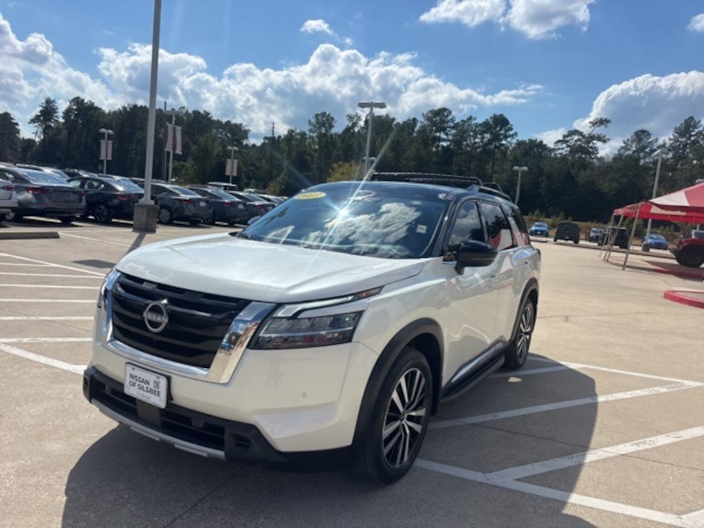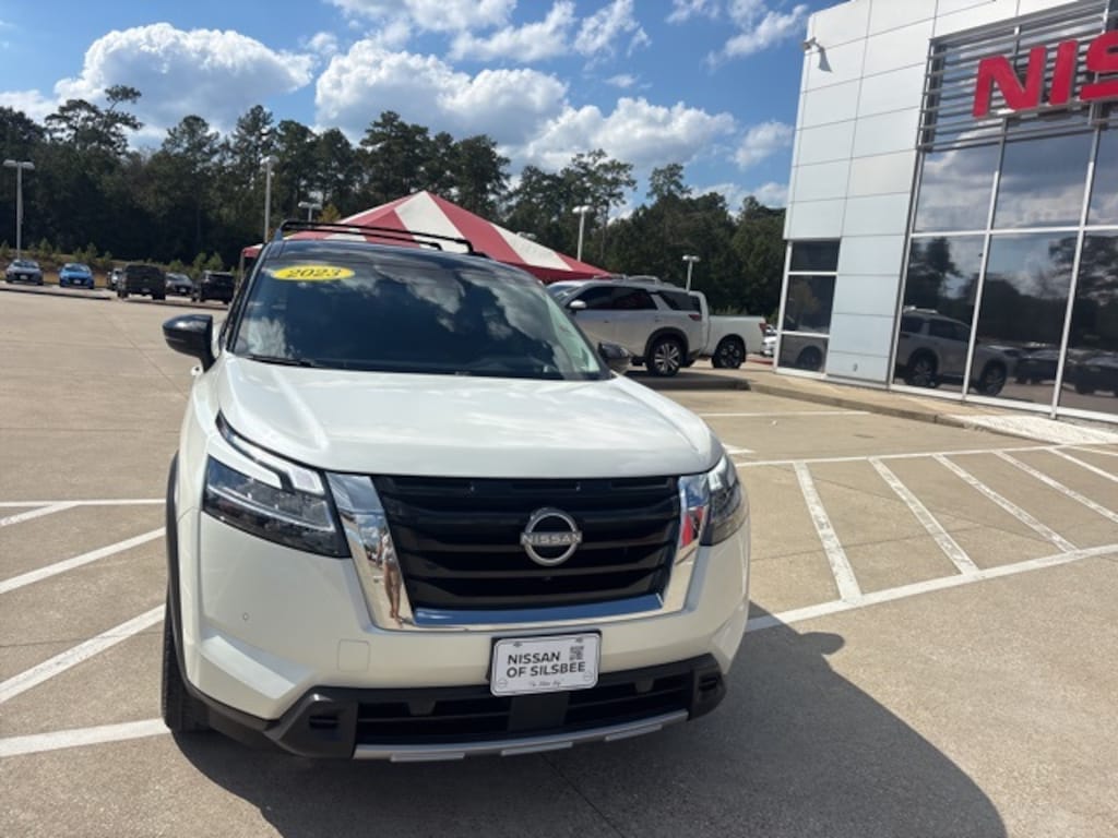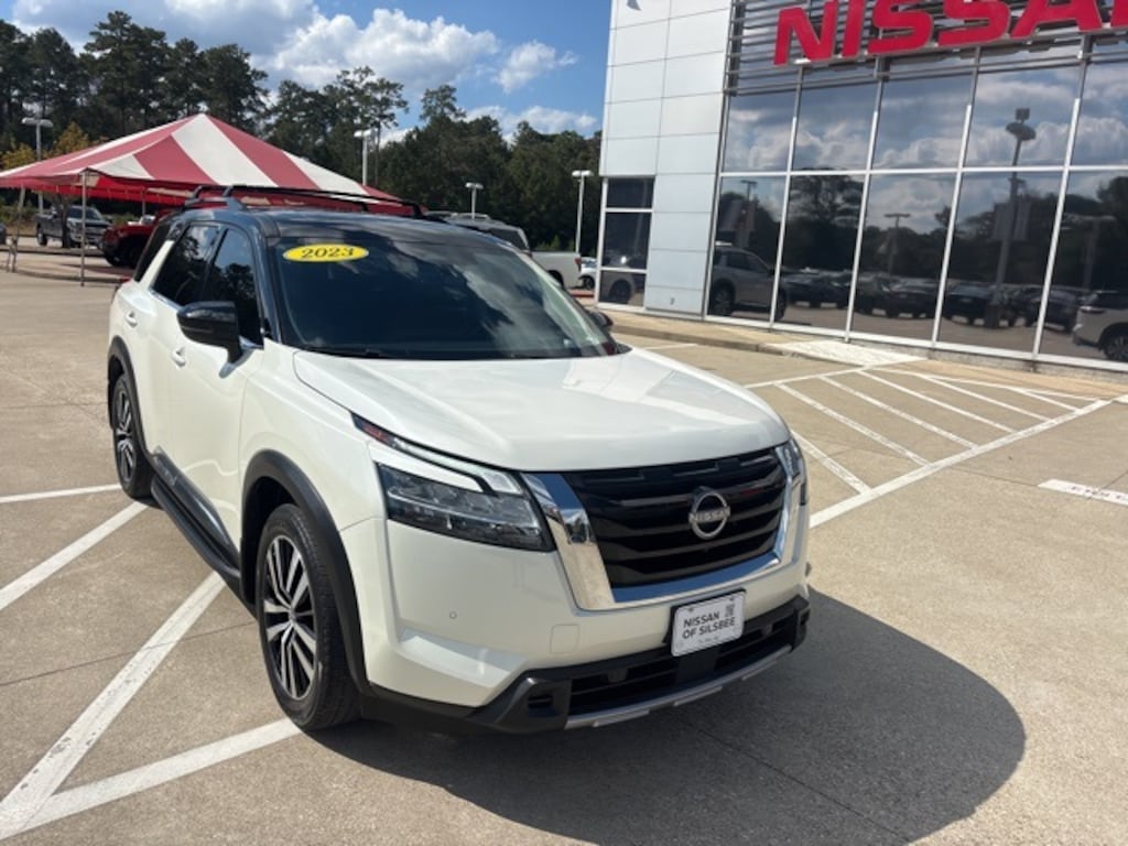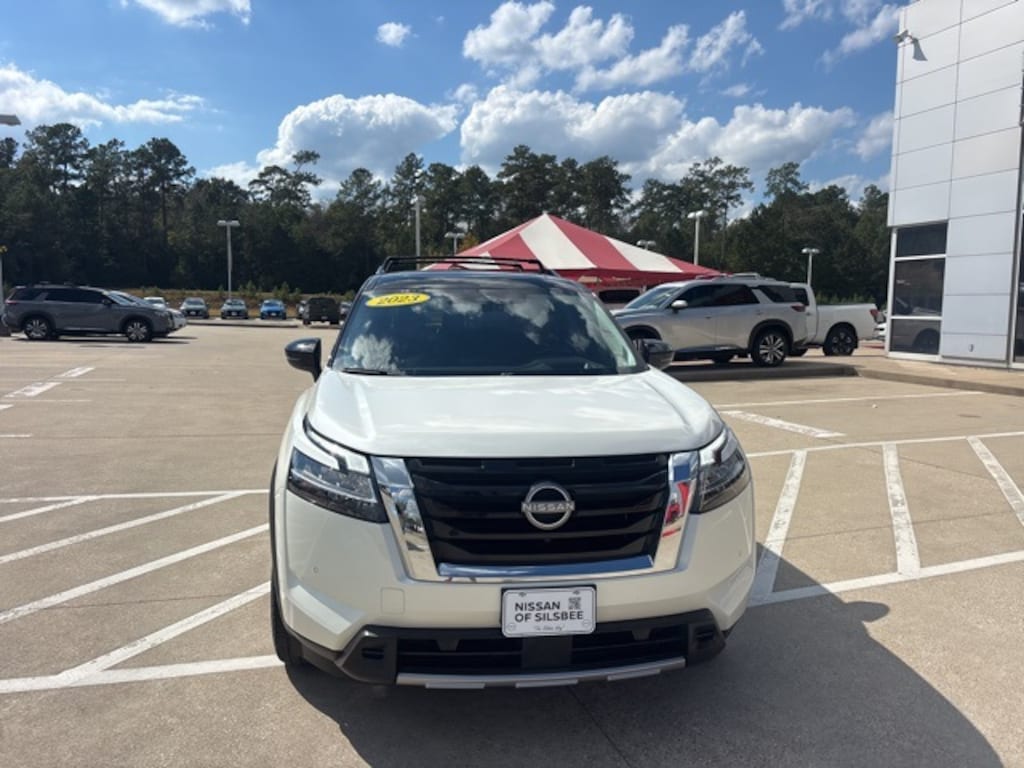 2023 Pearl White Tricoat/Super Black Nissan Pathfinder Platinum V6 FWD 9-Speed Automatic